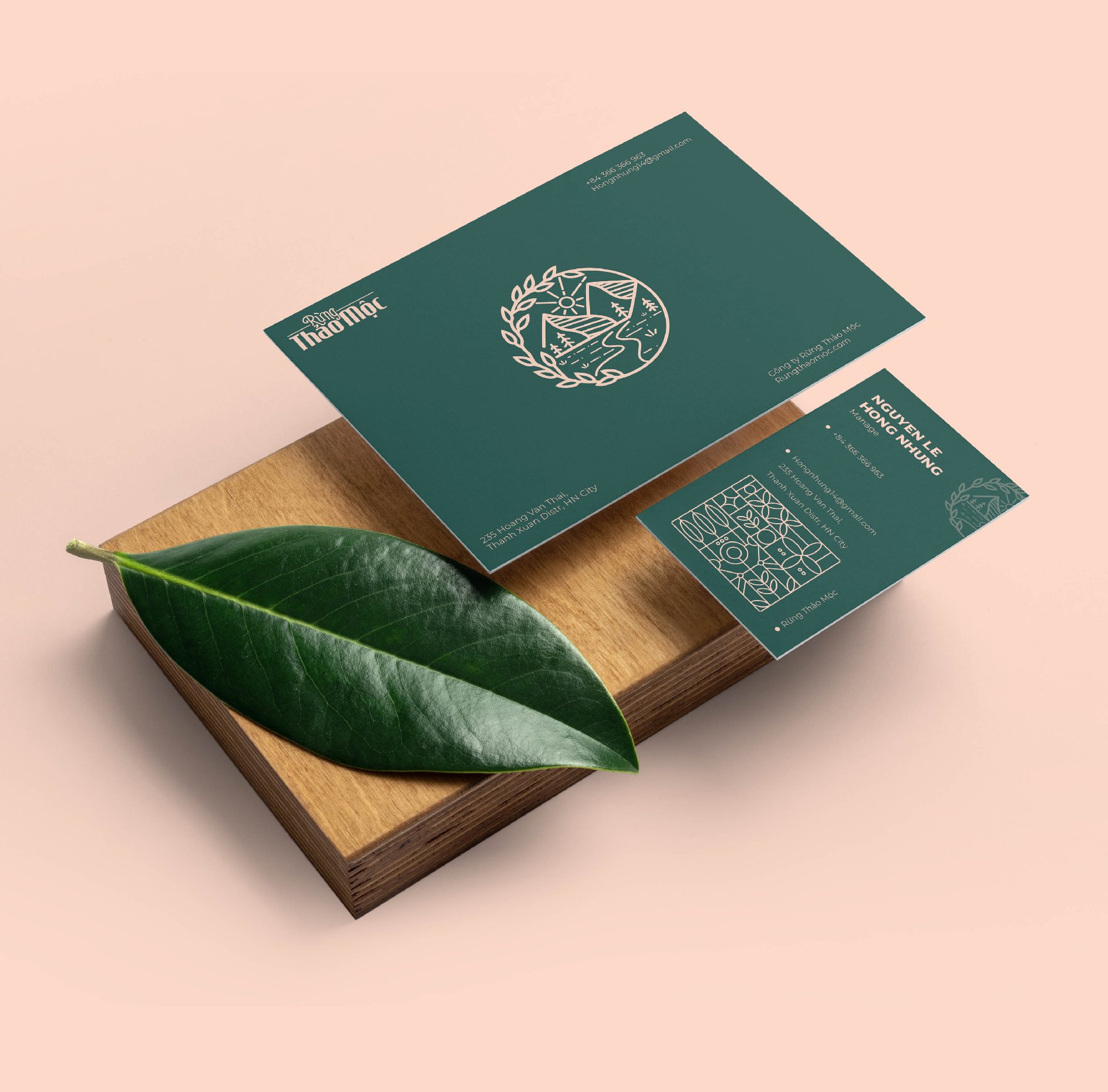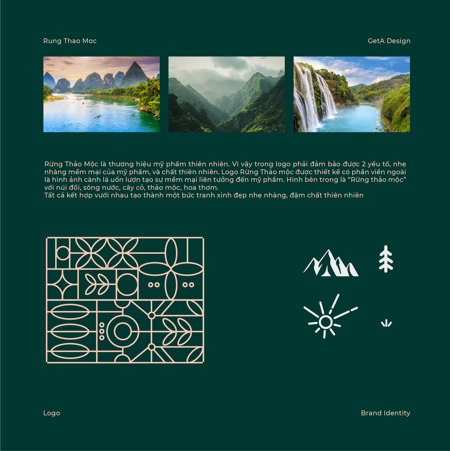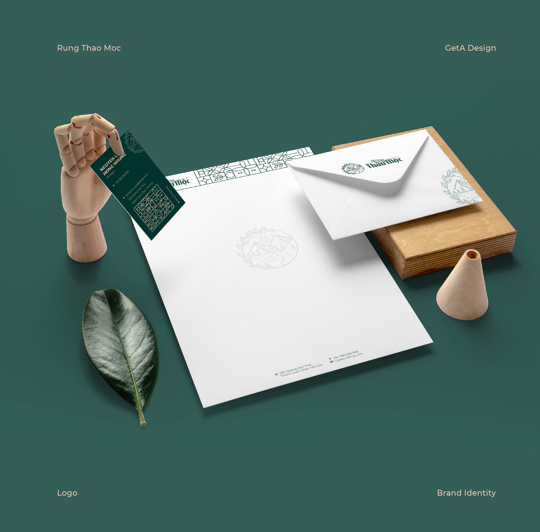 - The name “Rung Thao Mocc” is designed with rounded, organic letterforms, which mirror the gentle flow of the leaves and landscape, reinforcing the feeling of nurturing and natural care.