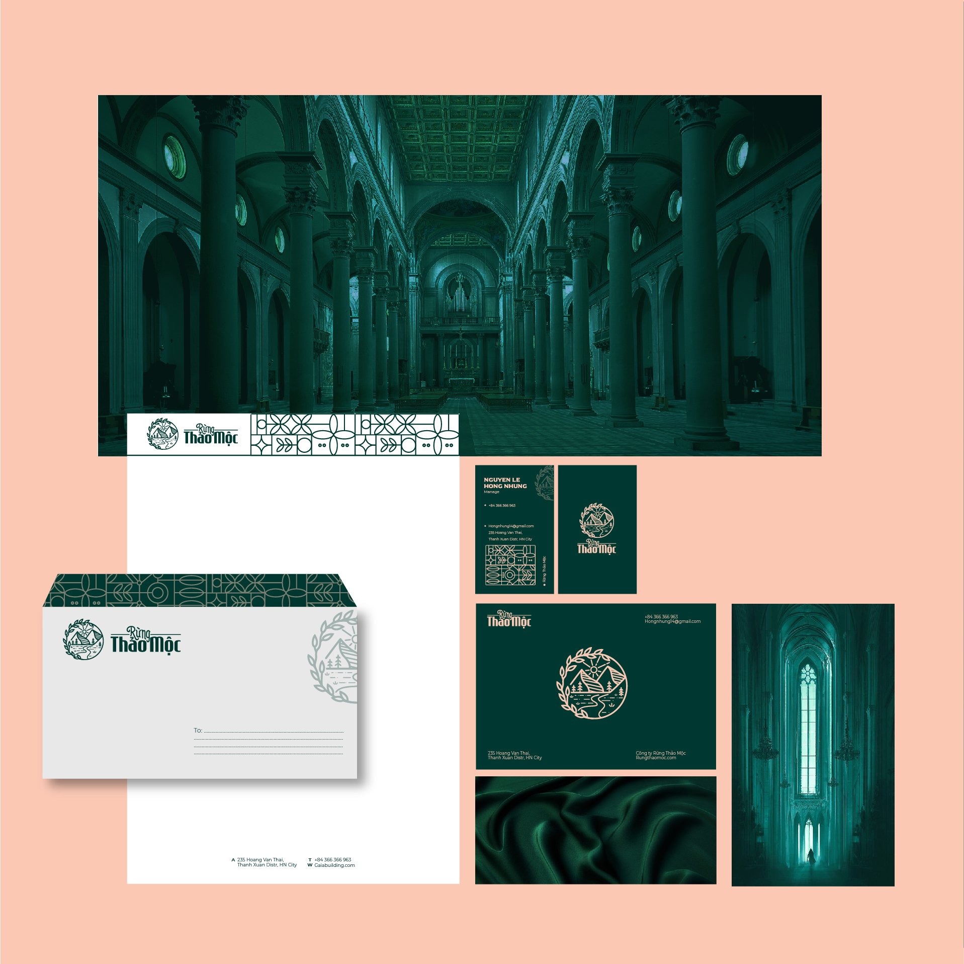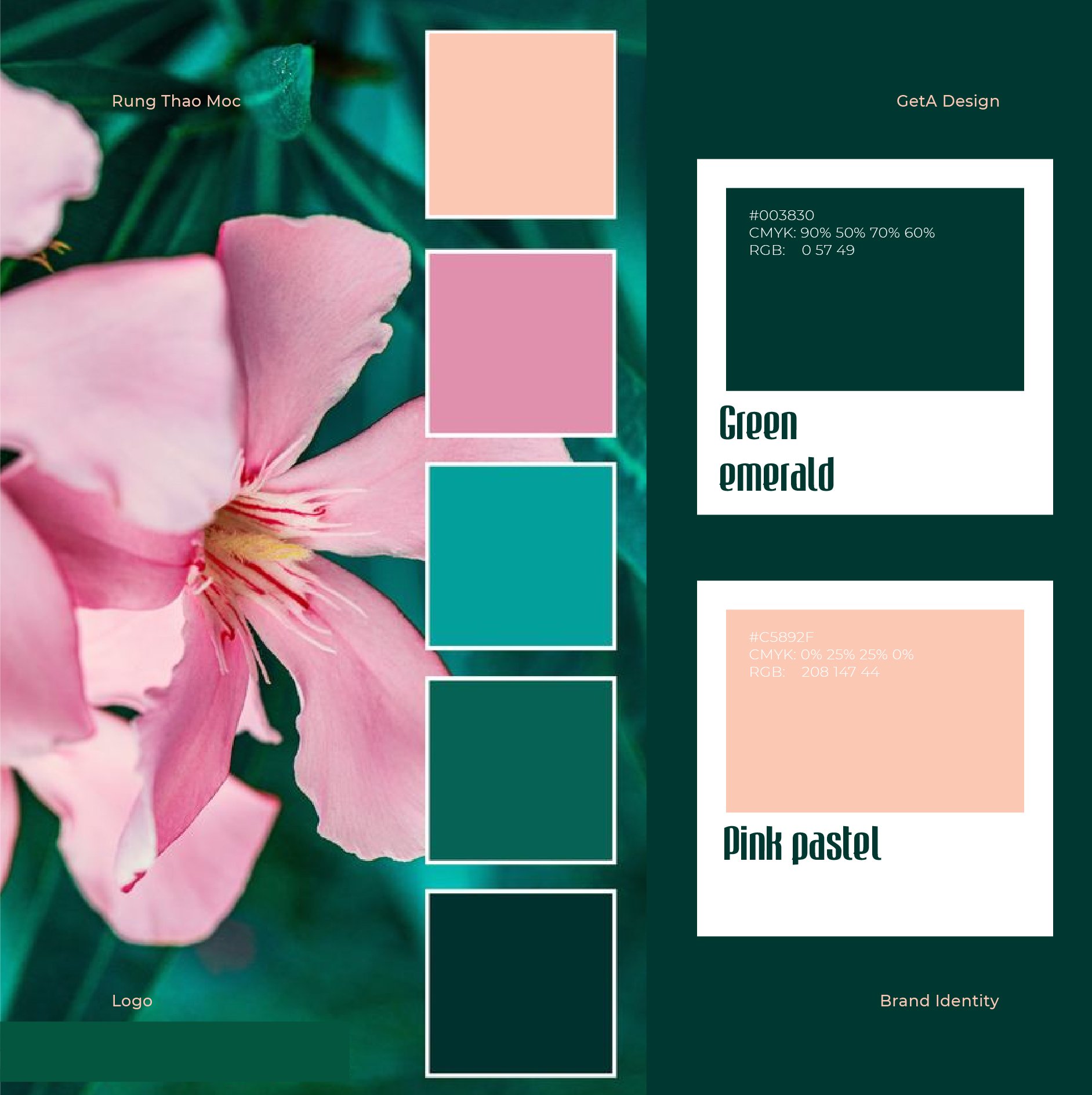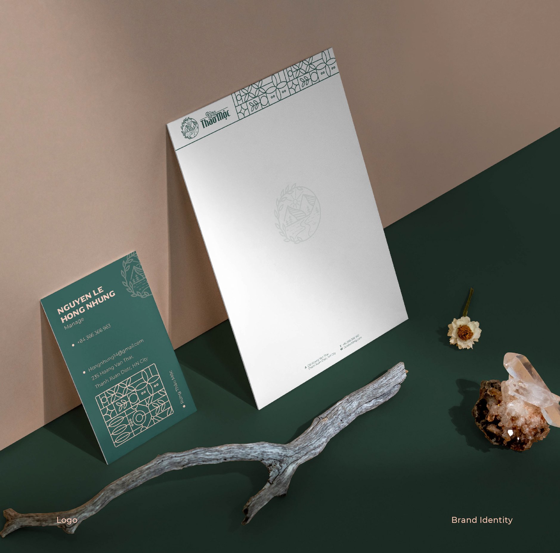 - The name “Rung Thao Mocc” is designed with rounded, organic letterforms, which mirror the gentle flow of the leaves and landscape, reinforcing the feeling of nurturing and natural care.